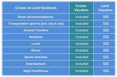 In fact, you could save money by taking a cruise. Just to prove it, use the handy chart to compare what is included in the cost of a cruise versus what costs would be a la carte ($) in a typical land-based vacation. Chances are, when you add it all up, you’ll probably get a lot more vacation taking a cruise for a lot less money. Cruise rates can be as low as $40 per day.